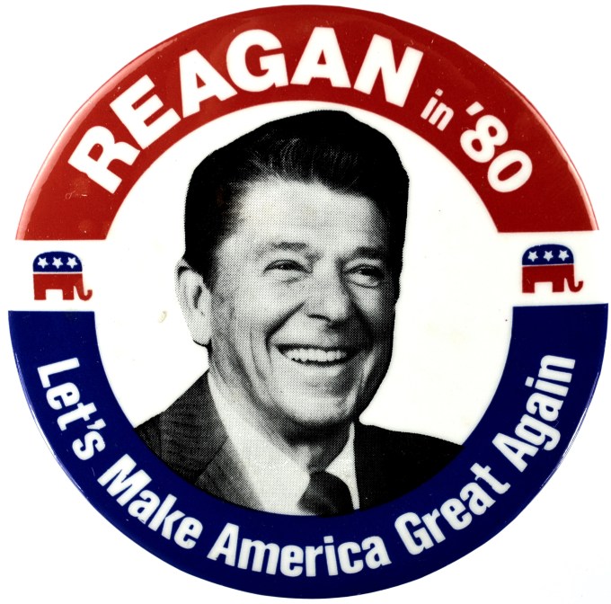 For starters, it is hardly original. The late former President Ronald Reagan’s 1980 campaign slogan was “Let’s Make America Great Again” (photo at the top is a 1980 Reagan campaign button). Perhaps Mr. Trump was channeling his inner Reaganus Maximus when he chose his campaign slogan, simply dropping the word “Let’s” from Reagan’s 1980 slogan.