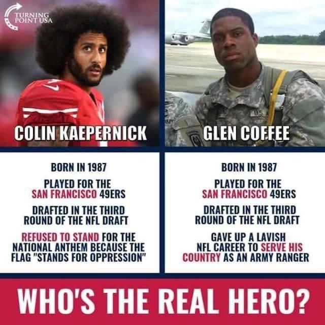 As a retired Army Soldier, one would think I would be inclined to support Coffee over Kaepernick. However, I recognize what both men represent and I respect them both for their choices.