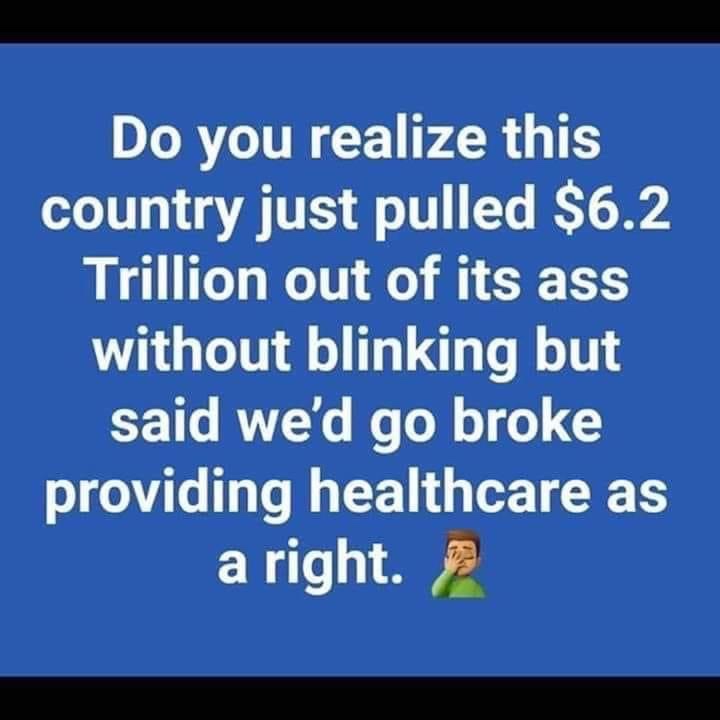 Firstly, this meme is inaccurate because the amount cited, $6.2 trillion, is about $4 trillion more than the cost of the Coronavirus Aid, Relief, and Economic Security (CARES) Act, which is $2.2 trillion. That alone invalidates the meme’s message since it isn’t factually correct. Of course, such messages are only concerned with engendering feelings, not dealing in fact.