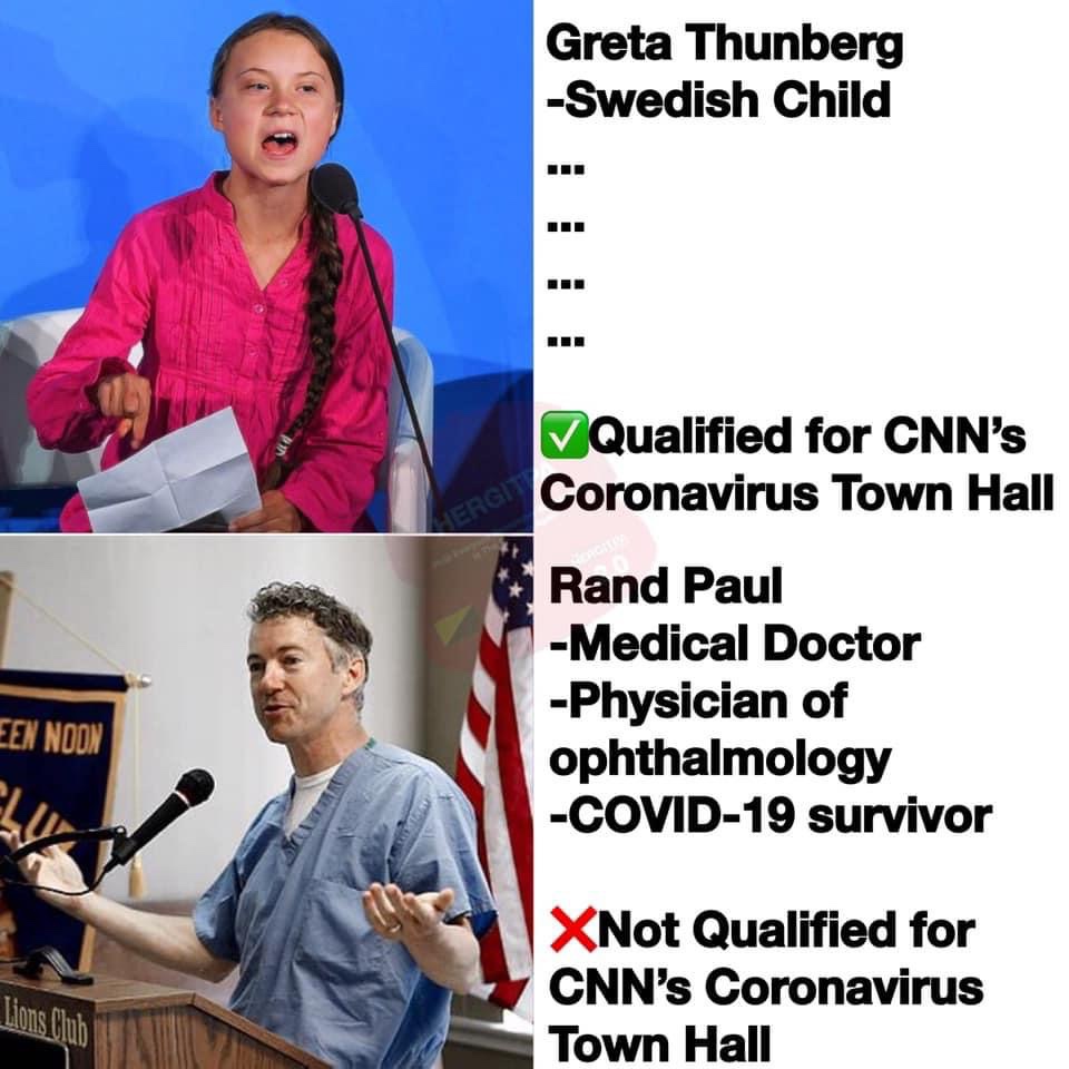 While I realize that the above meme is making a partisan political statement (a right-leaning one in this case), unlike most political memes that I typically enjoy deconstructing, there is a great deal of truth in the fact that while Senator Rand Paul (R-Kentucky) is a Republican (who claims to be libertarian) politician, he is also a licensed physician who actually contracted and recovered from COVID-19 and is far, far more qualified than most people on the planet to be on CNN’s panel, and certainly more qualified than a 17 year old climate change activist from Sweden.